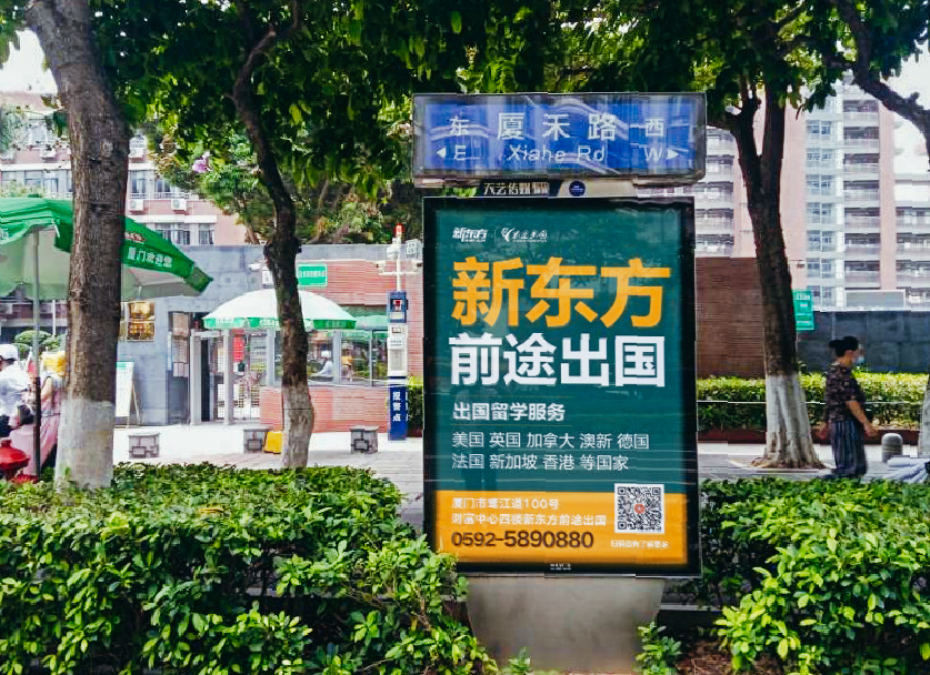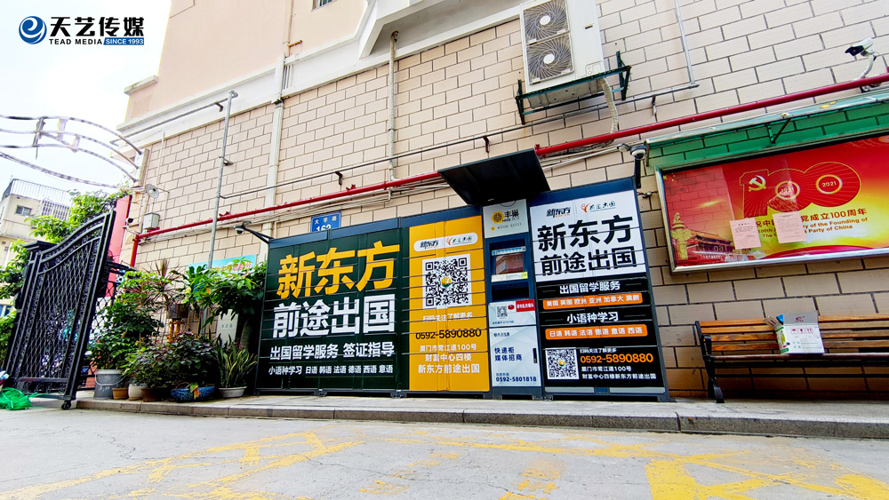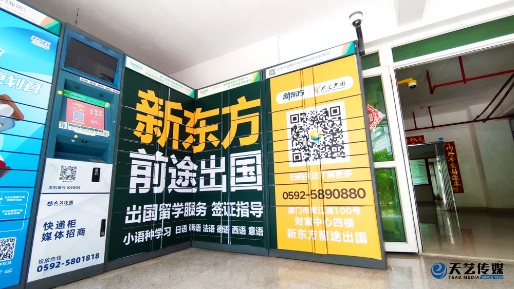 廈門新東方前途出國(guó)服務(wù)機(jī)構(gòu)位于鷺江道財(cái)務(wù)中心四樓,與廈門天藝傳媒合作,目前在主干道路名牌與生活小區(qū)的快遞柜媒體進(jìn)行部分宣傳合作。